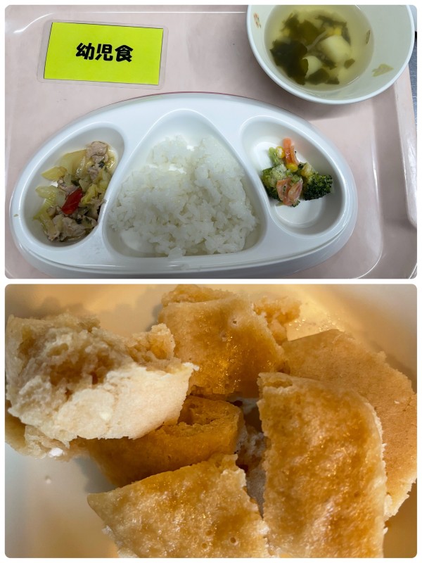 御飯、豚肉と野菜の味噌炒め、ブロッコリーのマヨ和え、わかめスープ 15時のおやつ 黒糖蒸しパン