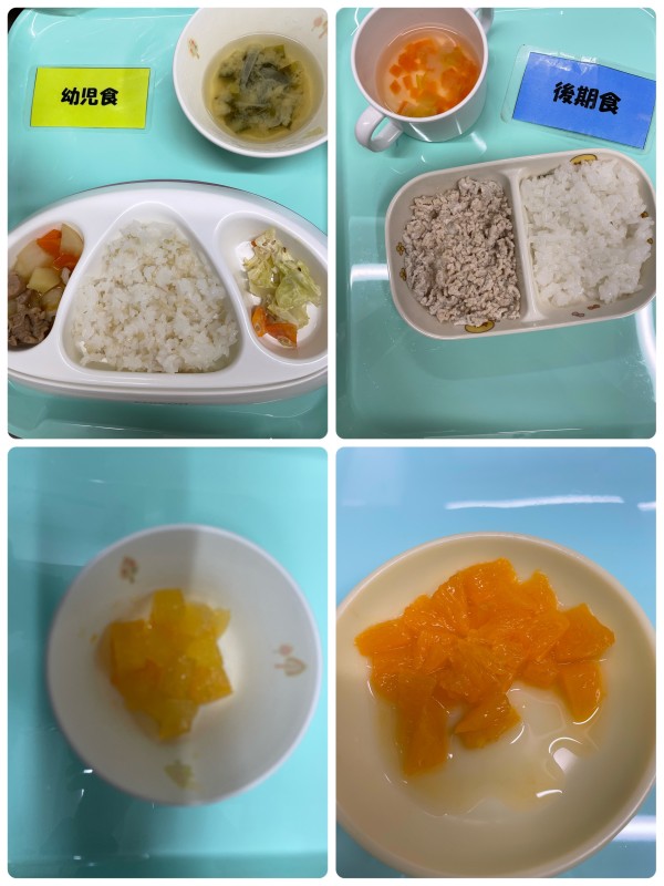 後期 軟飯、鶏そぼろ煮、みそ汁 完了期 御飯、おでん風煮物、キャベツのごまマヨ和え、みそ汁 15時のおやつ オレンジ、オレンジゼリー