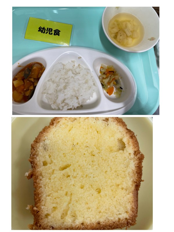 御飯、鶏と野菜のトマト煮、キャベツの昆布和え、みそ汁 15時のおやつ パウンドケーキ
