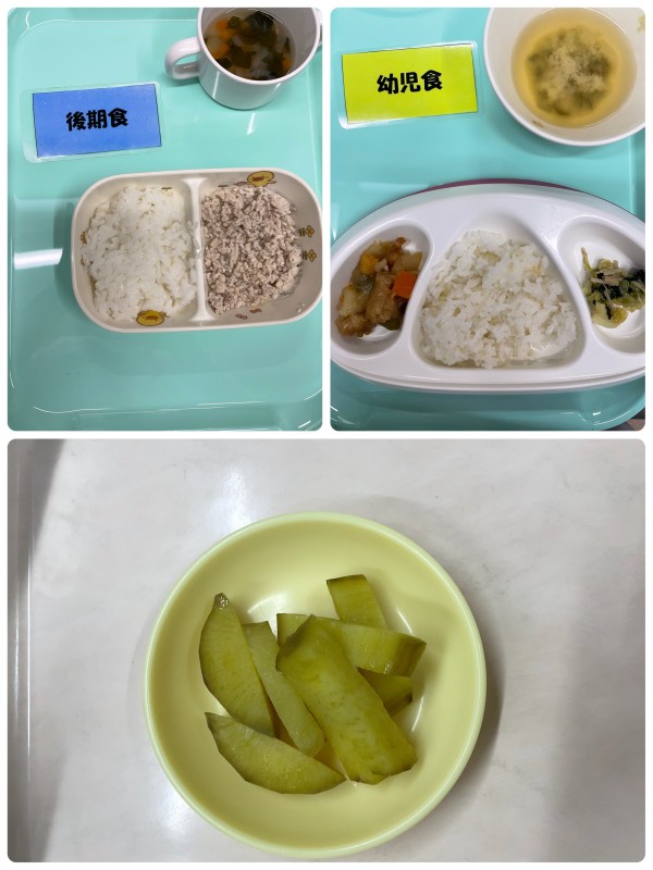 後期 軟飯、鶏そぼろ煮、みそ汁 完了期 ご飯、鶏の甘酢煮、ほうれん草とえのきのお浸し、みそ汁 15時のおやつ 蒸し芋
