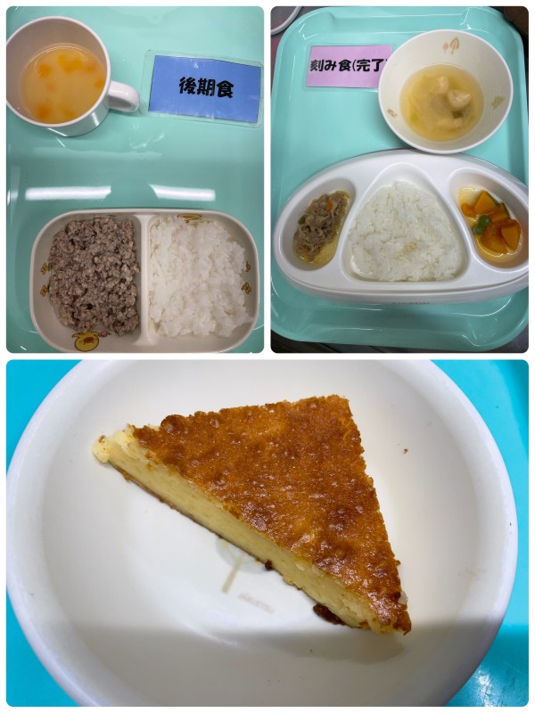 後期 軟飯、豚そぼろ煮、みそ汁 完了期 御飯、豚肉と野菜のカレー炒め、かぼちゃのグリンピースあんかけ、みそ汁 15時のおやつ ハイハイン、チーズケーキ