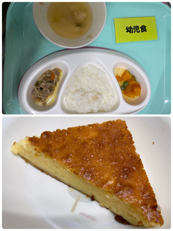 御飯、豚肉と野菜のカレー炒め、かぼちゃのグリンピースあんかけ、みそ汁 15時のおやつ チーズケーキ
