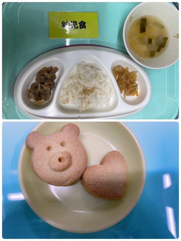 御飯、豚肉のしょうが焼き、切り干し大根の煮物、みそ汁 15時のおやつ クッキー