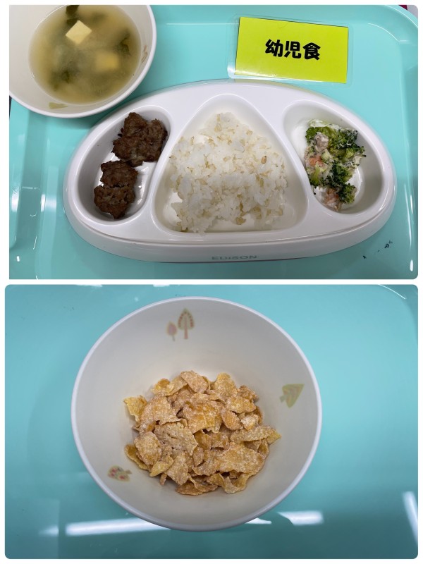 ご飯、ハンバーグ、ブロッコリーのマヨサラダ、みそ汁 15時のおやつ コーンフレーク