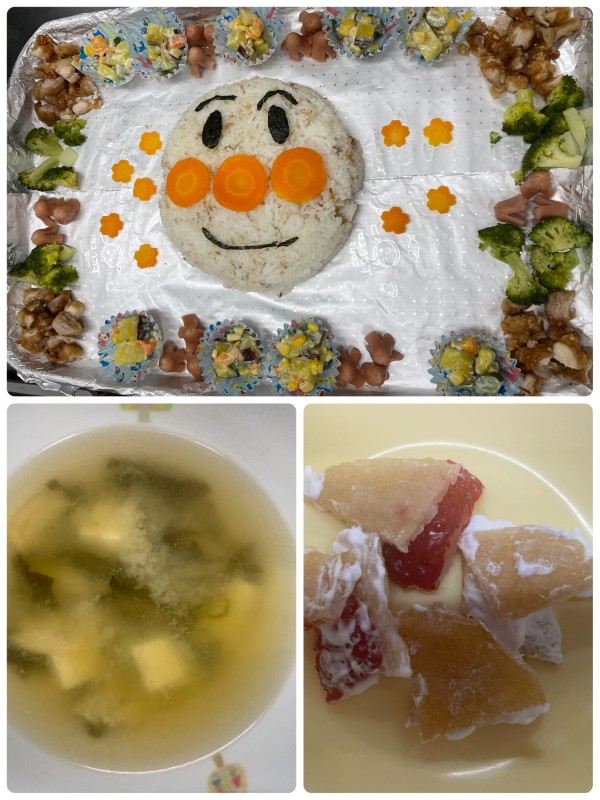 アンパンマンライス、唐揚げ、タコウインナー、ゆでブロッコリー、さつまいものマヨサラダ、豆腐みそ汁 15時のおやつ クレープ