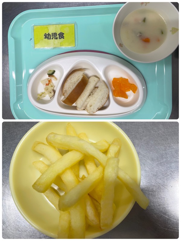 パン、クリームシチュー、キャベツの胡麻サラダ、みかん缶 15時のおやつ フライドポテト
