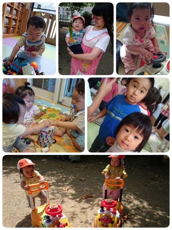 1週間の始まりです。暑い日が続きます。汗をかきながらも、元気に過ごしています。今日、朝の集いで名前を呼んでいくと、みんなニコニコ笑顔が溢れていて、こちらまで とても嬉しく、気持ち良い1日の始まりとなりました。ハイハイやつたい歩き、そして一歩ずつゆっくりと歩いて、部屋でも公園でもよく動いています。