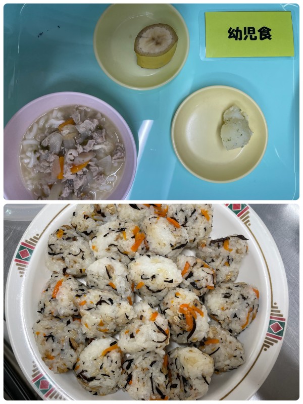 豚汁うどん、ベイクドじゃが、バナナ 15時のおやつ ひじきおにぎり