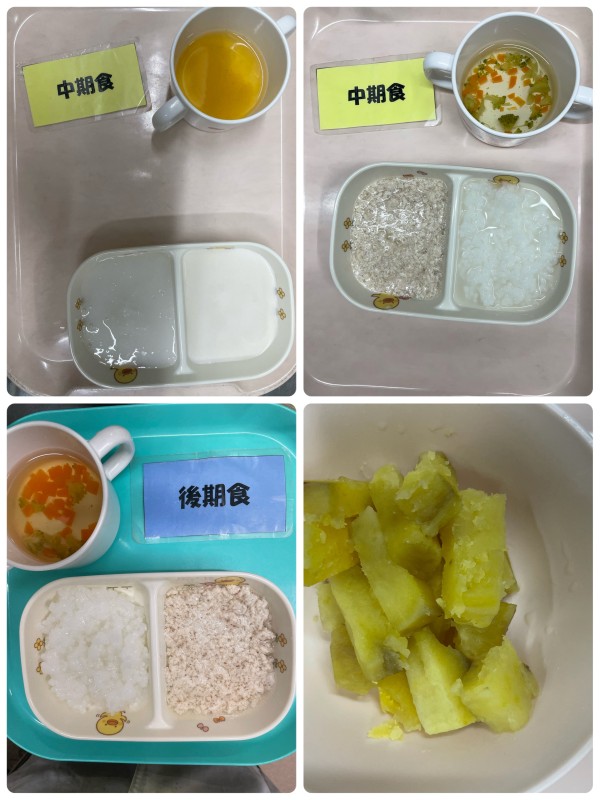 中期 7倍粥、鶏そぼろ煮、すまし汁 後期 5倍粥、鶏そぼろ煮、すまし汁 15時のおやつ 蒸し芋