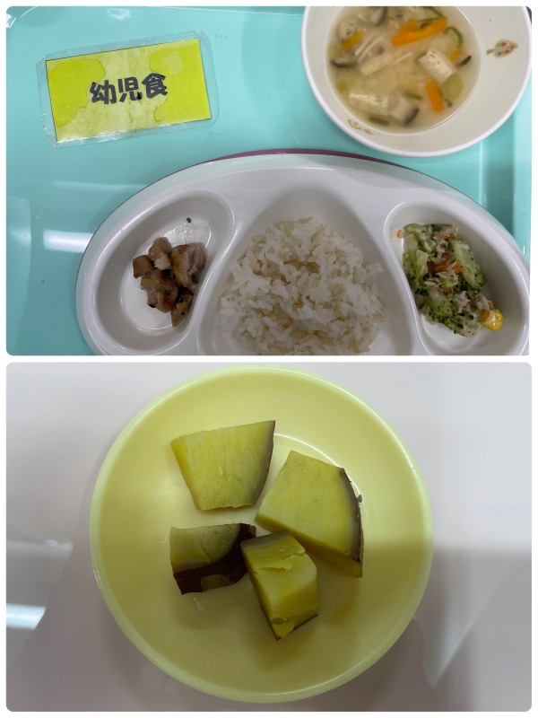 ご飯、鶏のゴマ照り焼き、ブロッコリーのマヨあえ、そうめん汁 15時のおやつ 蒸し芋