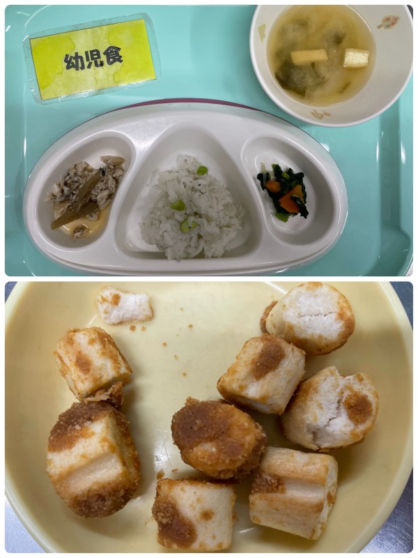枝豆とじゃこのご飯、さわらとごぼうの煮付け、ほうれん草のお浸し、みそ汁 15時のおやつ きな粉ふのラスク