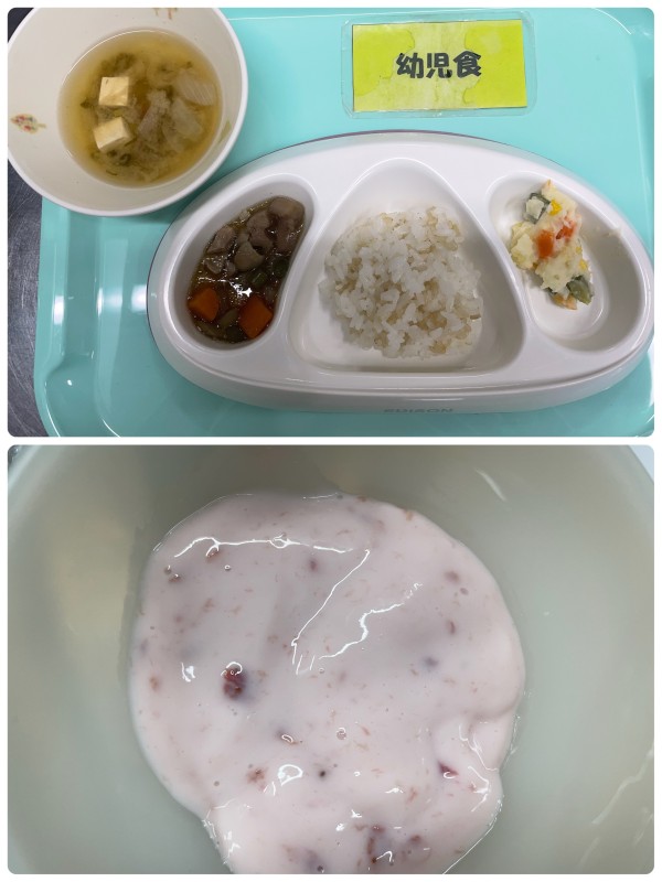 ご飯、筑前煮、ポテトサラダ、みそ汁 15時のおやつ フルーチェ