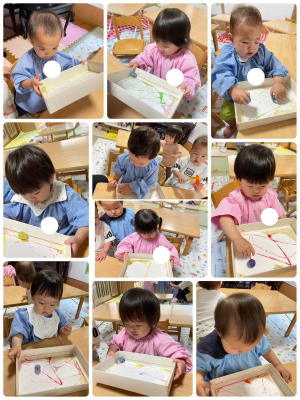 今日は製作で絵の具のついたビー玉を箱の中で転がしました!手で転がす子もいれば、箱を持って転がす子も!自分なりの方法で楽しんでいましたよ🥰画用紙に色がつく様子を「おー!✨」と大興奮で伝えてくれました!