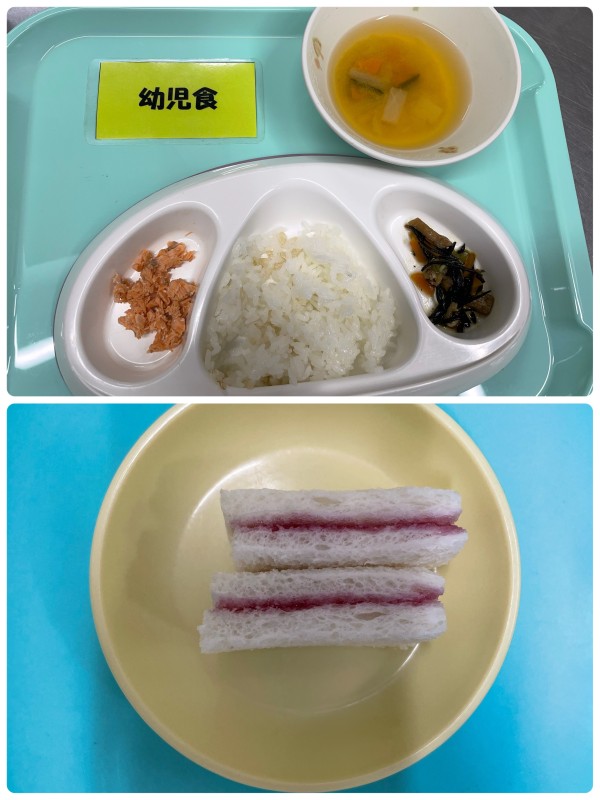 ご飯、鮭の塩焼き、ひじきの煮物、みそ汁 15時のおやつ ブルーベリージャムサンド