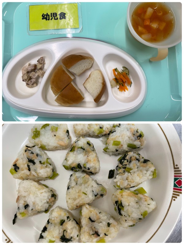 パン、タンドリーチキン、きゃべつの酢和え、ミネストローネ 15時のおやつ おさかなおにぎり