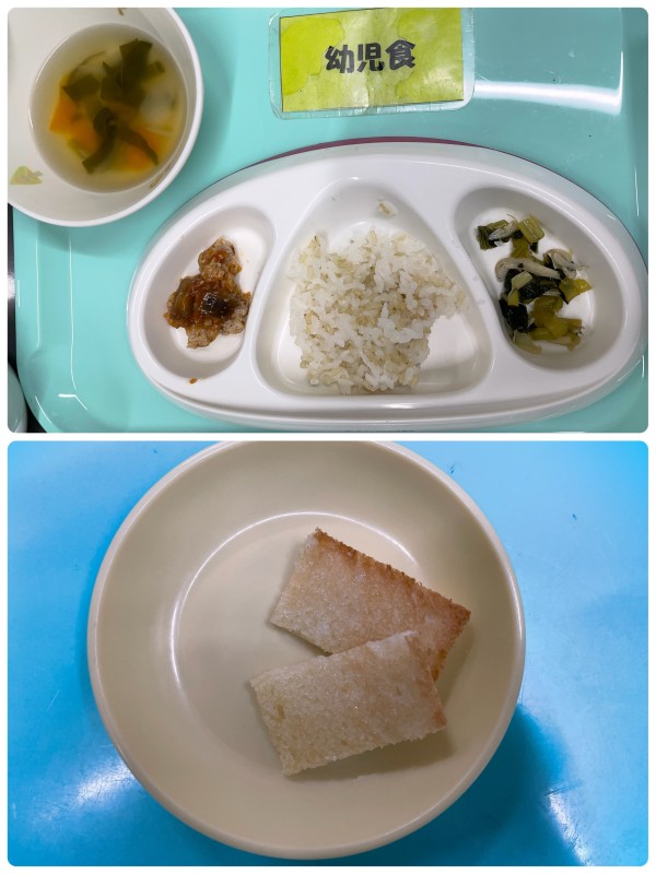 ご飯、ミートボールのトマト煮、小松菜のしらす和え、スープ 15時のおやつ シュガーバタートースト