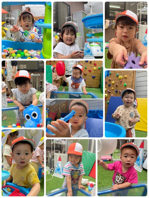 みんなの大好きな水遊びがはじまっています💙🐬小さな玩具をポイですくったり水鉄砲で遊んだり、、、。楽しそうな声が響き渡っています!夏のあいだ沢山楽しもうね!😊