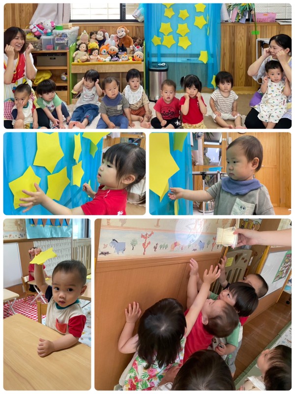 今日は七夕の会がありました🎋 うたや絵本を楽しんだり、星を探して天の川をつくるお手伝いをしてくれました💫 天井に映し出される星を見つけると指を差して、大興奮❕❕ たくさんのお星さま、きれいだったね☺️みんなのお願いごとが叶いますように🌟
