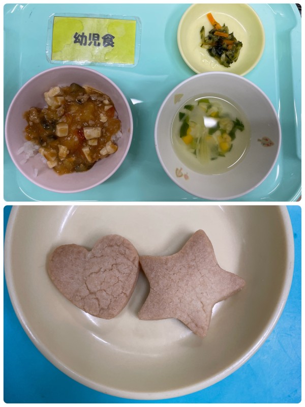 夏野菜たっぷり麻婆丼、きゅうりの中華サラダ、中華スープ 15時のおやつ クッキー