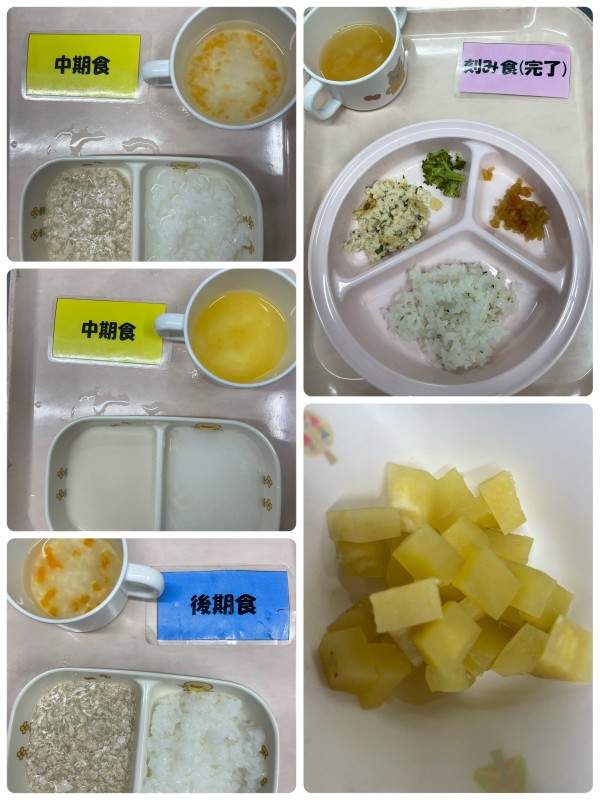 中期 7倍粥、鶏そぼろ煮、みそ汁 後期 5倍粥、鶏そぼろ煮、みそ汁 完了期 菜飯、鶏つくね、切り干し大根の旨煮、みそ汁 15時のおやつ 蒸し芋