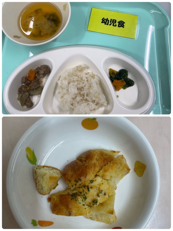 ご飯、豚肉とごぼうの炒め煮、ほうれん草のおかか和え、みそ汁 15時のおやつ ツナパン