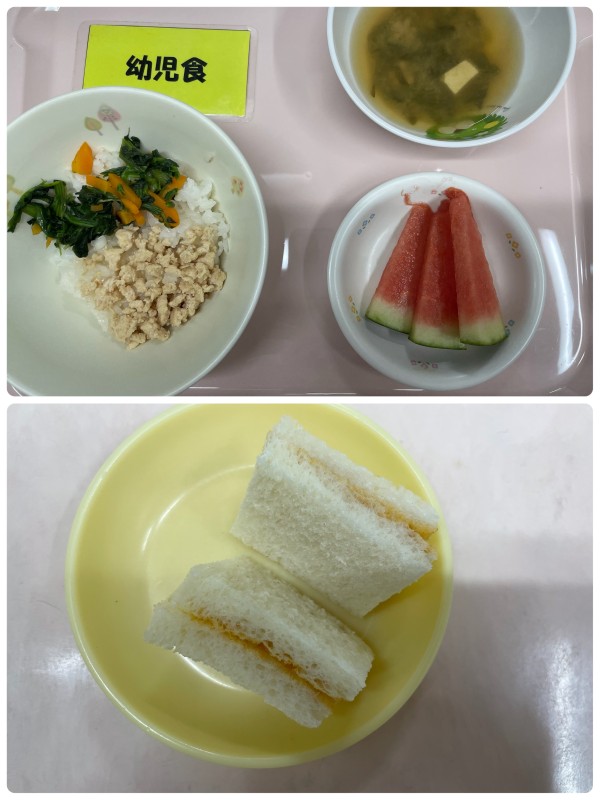 三色どんぶり、みそ汁、すいか 15時のおやつ きなこバターサンド