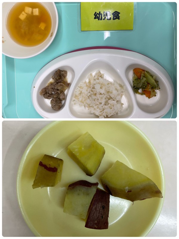 御飯、豚肉の生姜焼き、ブロッコリーのおかか和え、みそ汁 15時のおやつ 蒸し芋
