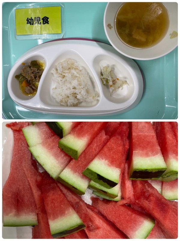 御飯、豚肉とピーマンのカレー炒め、キャベツのしらす和え、みそ汁 15時のおやつ スイカ