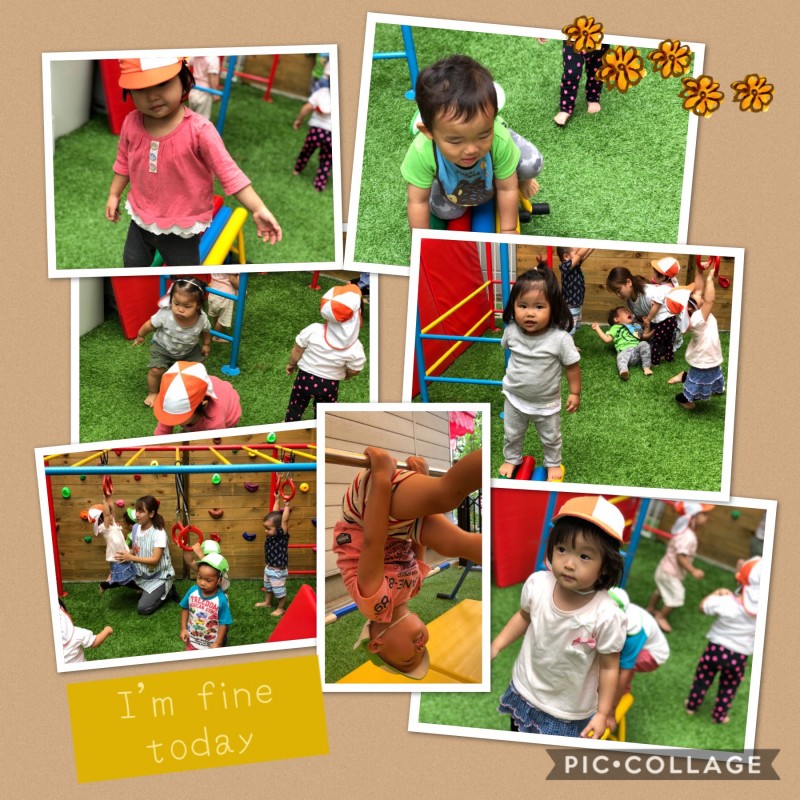 今日は芝生に行って遊びました。鉄棒やうんてい、平均台をしました。「先生見てみて」と鉄棒や平均台を見せてくれます。キラキラな目をして「出来たよ!すごい?」と嬉しそうでした!