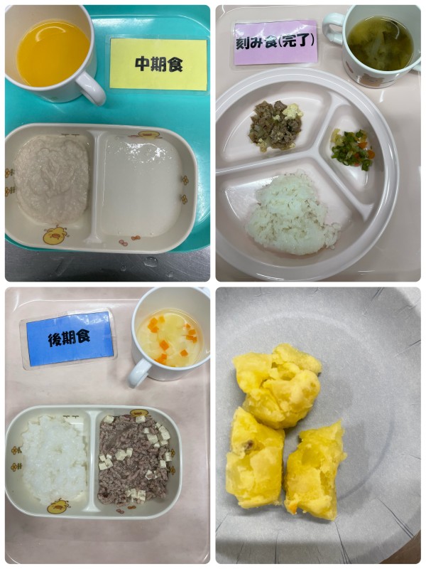 中期 7倍粥、鶏と豆腐のそぼろ煮、みそ汁 後期 5倍粥、豚と豆腐のそぼろ煮、みそ汁 完了期 ご飯、肉豆腐、いんげんの胡麻和え、みそ汁 15時のおやつ 蒸し芋、アップルポテト