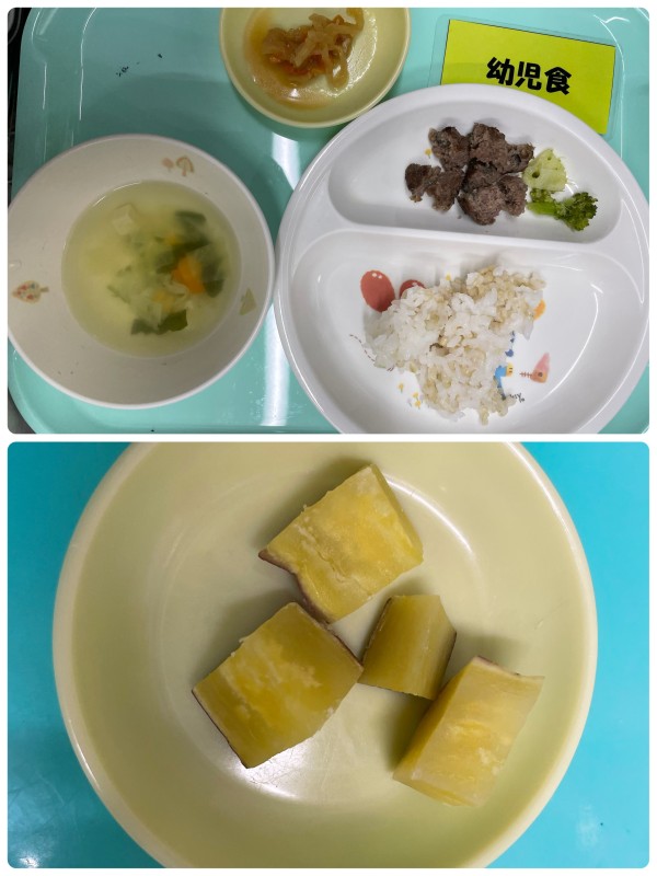 御飯、ハンバーグ、茹でブロッコリー、切り干し大根の旨煮、スープ 15時のおやつ 蒸し芋