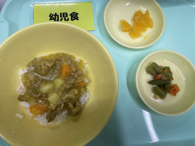 カレーライス、いんげんのおかか煮、オレンジ 15時のおやつ パン