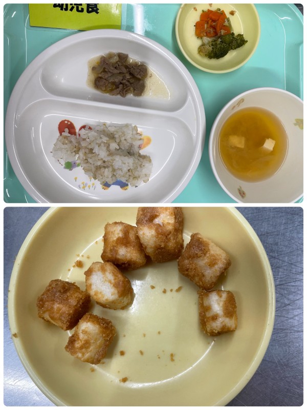 ご飯、豚肉のしょうが焼き、ブロッコリーのおかか和え、みそ汁 15時のおやつ きな粉麩のラスク