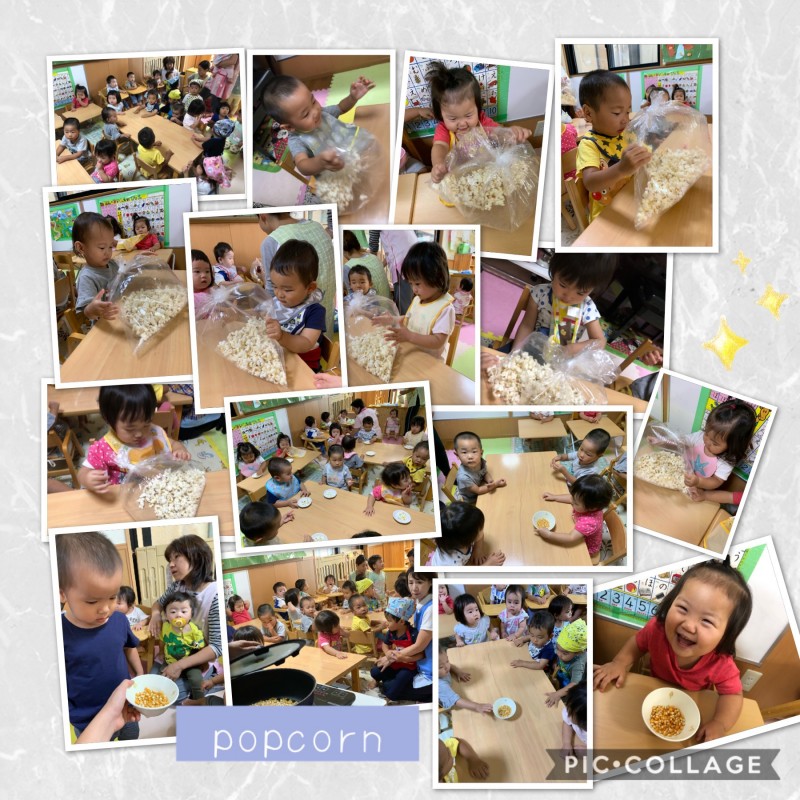 今日は芝生で遊びました。玉入れの練習をしました。うさぎさんがあまりにも上手でびっくりしました。いちにのさーん!といって投げる姿がとても可愛かったです。 クッキングではポップコーン作りをしました。ポン!と弾ける音を楽しんだり、味付けをみんなでしました。