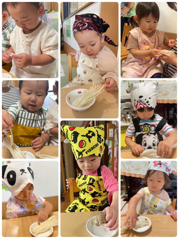 クッキングできのこさきをしました❕沢山のきのこに興味津々のうさぎ組さん、きのこが出てくると手を伸ばし…。不思議な感触に戸惑う子、夢中でさく子など、色々な姿を見せてくれました☺️みんなで上手にさくことができたね💮