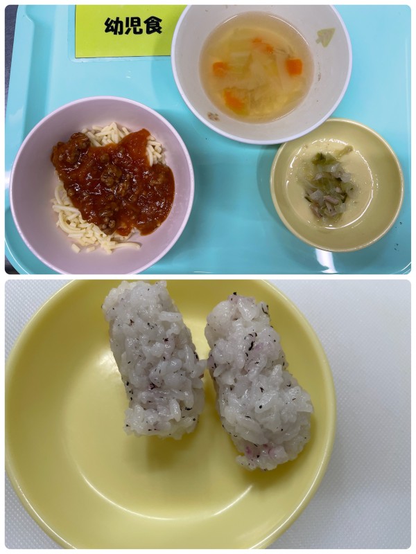 ミートスパゲッティ、キャベツとツナの酢の物、スープ 15時のおやつ ゆかりおにぎり