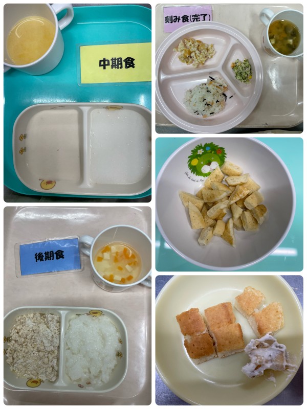 中期 7倍粥、鶏そぼろ煮、豆腐みそ汁 後期 5倍粥、鶏そぼろ煮、豆腐みそ汁 完了期 鮭とひじきの混ぜご飯、オカラナゲット、ブロッコリーとツナのマヨあえ、豆腐みそ汁 15時のおやつ ホットケーキ、ホットケーキ バナナクリーム添え