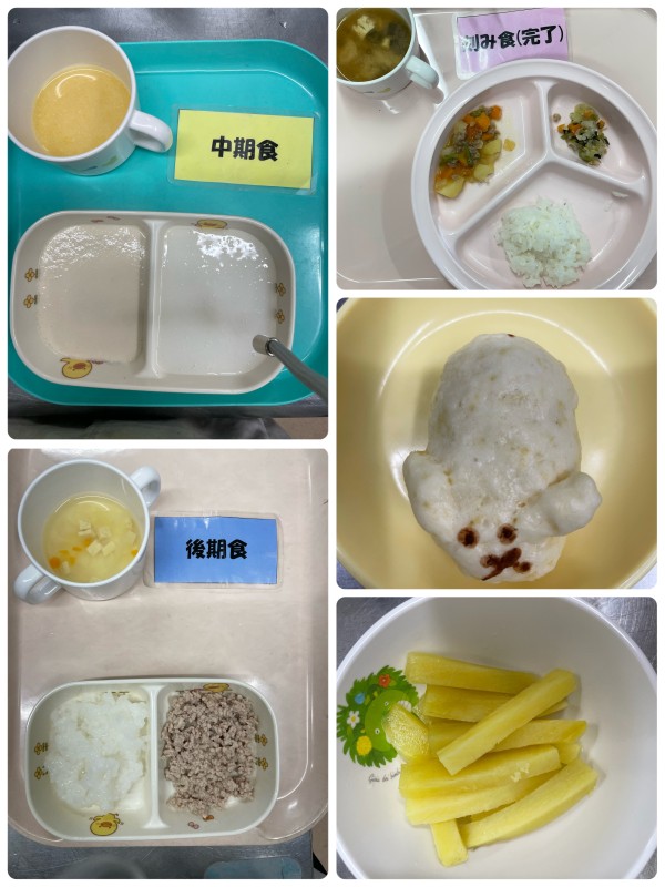 中期 7倍粥、鶏そぼろ煮、豆腐みそ汁 後期 5倍粥、豚そぼろ煮、豆腐みそ汁 完了期 ご飯、肉じゃが、キャベツと小松菜のツナ和え、豆腐みそ汁 15時のおやつ 蒸し芋、お月見まんじゅう🐰🌕