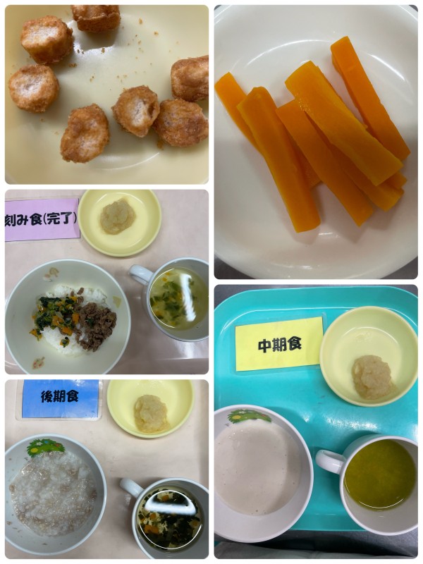 中期 鶏そぼろおじや、スープ、りんご 後期 豚そぼろおじや、スープ、りんご 完了期 キッズビビンバ、中華スープ、りんご 15時のおやつ きな粉ふのラスク、スティックにんじん