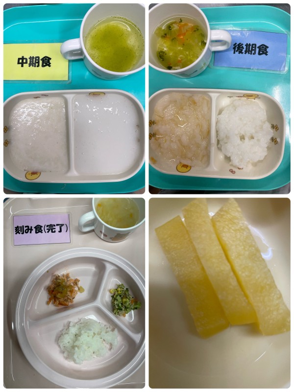 中期 7倍粥、白身魚の煮付け、スープ 後期5倍粥、白身魚の煮付け、スープ 完了期 ご飯、鮭のホイル焼き、ブロッコリーのサラダ、押し麦のスープ 15時のおやつ 蒸し芋