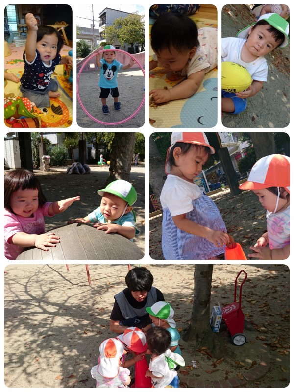 公園で遊びました。フラフープやボール遊びを楽しみました。三角コーンの穴が気になり、中を覗いたり、葉っぱを入れて遊んでいました。りす組の女の子は、脱げた帽子を被らせてくれたり、一緒に遊んでくれたりと、とても優しく接してくれます。