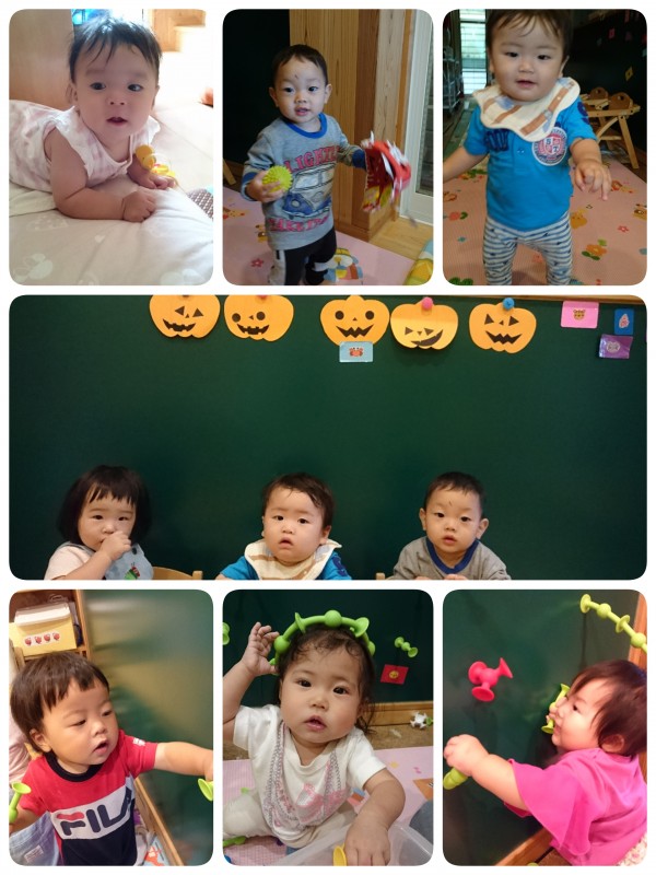ハロウィンの製作をしたり、吸盤ブロックで遊びました。色々な表情のカボチャができました🎃 一人がしていると「何をしているのかなー?」と、見に来て自分から椅子に座って順番を待ってくれます。吸盤ブロックでは、壁にくっつけたり、引っ張って取るのを繰り返し楽しみました。