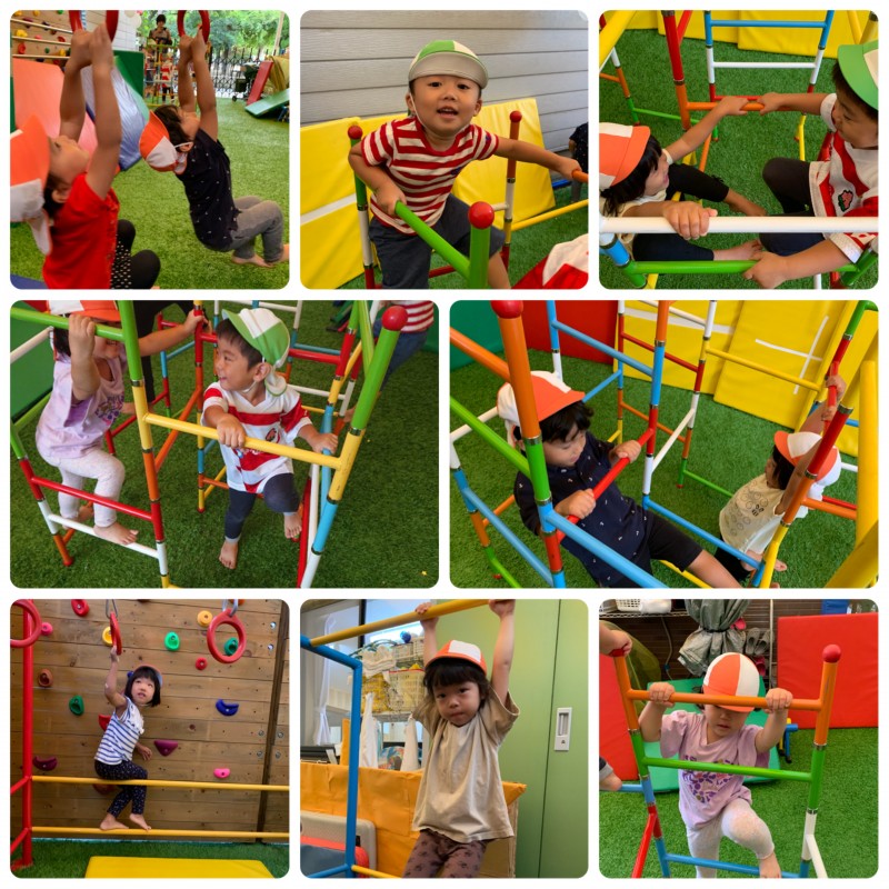 今日は、雨だったので芝生で遊びました。お友達と一緒につり革みたいなところにぶら下がり、顔を合わせて笑ったり、ジャングルジムでは、上手に登ったりジャングルジムの中をお友達とお話ししながらグルグルまわったりし、とても楽しそうに遊んでいました。また、前までは、ジャングルジムを登ったり降りたりしかできなかったお友達も、上手にジャングルジム内をグルグル回れるようになっており、成長が感じられ嬉しかったです♪怖がらずに色んなことに挑戦するようにもなり、これからの成長もとても楽しみです!!今日も元気いっぱいのリス組さんでした!