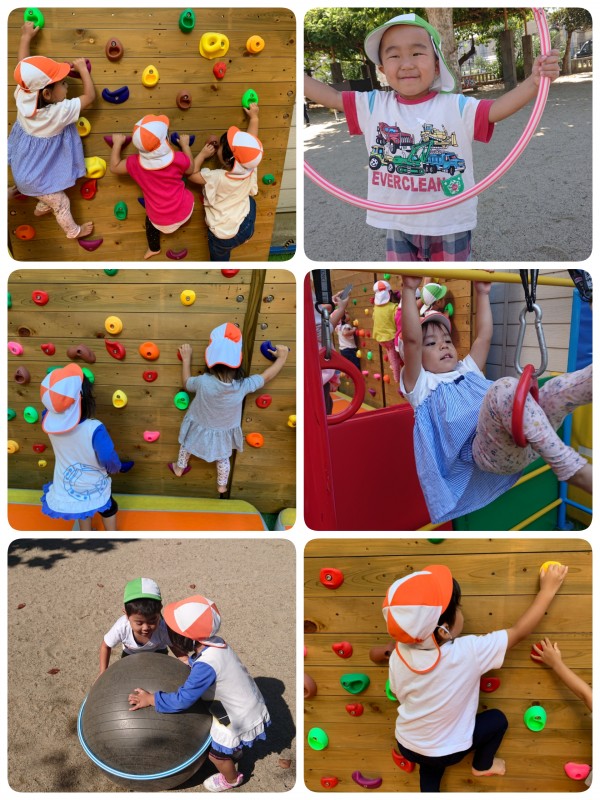 今日は公園と芝生で遊びました!!公園では、ブランコにのって遊んだり、大きいバランスボールをお友だちと一緒に転がしたりして遊んでいました!ボールを保育者の方に「投げて」といって投げてもらい楽しそうでした!芝生では、大きいマットの上でジャンプをしたり、前回りをしてくれていて楽しそうでした♪保育者に手伝ってもらいながら、ボルダリングをしていて何回もやっているうちに自分たちで登れるようになっていてすごかったです♪今日も1日元気いっぱいなりすさんでした!!!