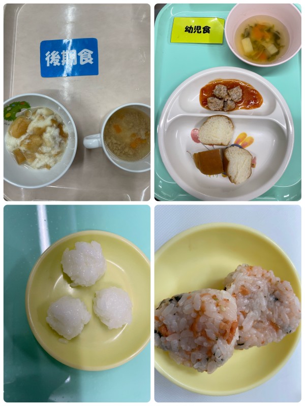 後期 パンがゆ、肉団子スープ 15時のおやつ 軟飯 幼児食 パン、ミートボールのトマト煮、スープ 15じのおやつ 鮭わかめおにぎり