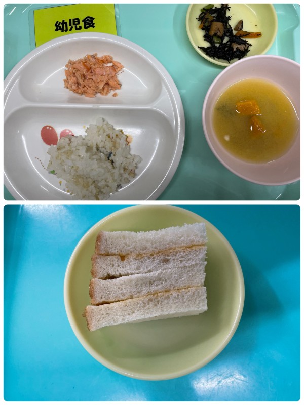 ごはん、鮭の塩焼き、ひじきの旨煮、みそ汁 15時のおやつ きな粉サンド