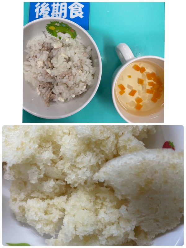 豚そぼろおじや、スープ 15時のおやつ 蒸しパン