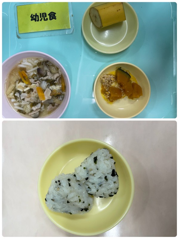 かやくうどん、かぼちゃの煮物、バナナ 15時のおやつ わかめおにぎり