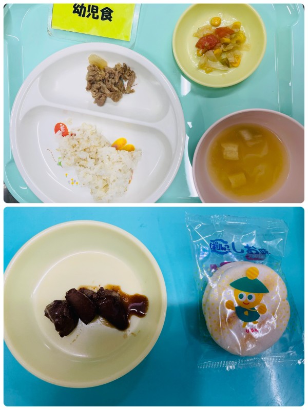 ご飯、豚肉のしょうが焼き、トマトとキャベツのサラダ、みそ汁 15時のおやつ レバーの甘辛煮、せんべい