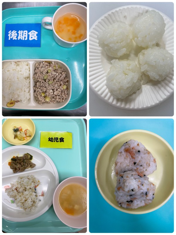 後期 ご飯、豚そぼろとさつまいもの甘煮、みそ汁 15時のおやつ おにぎり ご飯、豚肉と野菜のカレー炒め、さつまいもマヨサラダ、みそ汁 15時のおやつ おにぎり(さけ、のり)
